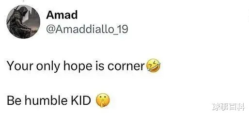 阿森纳被阿玛德抓住了“把柄”。他在社交媒体上回复一位赛前豪言“阿森纳4-0赢了我已拿到剧本”的球迷:“你的唯一希望就是角球”“低调点吧,小子”,并晒出3-2终局比分截图配文:“享受去吧,臭小子”。