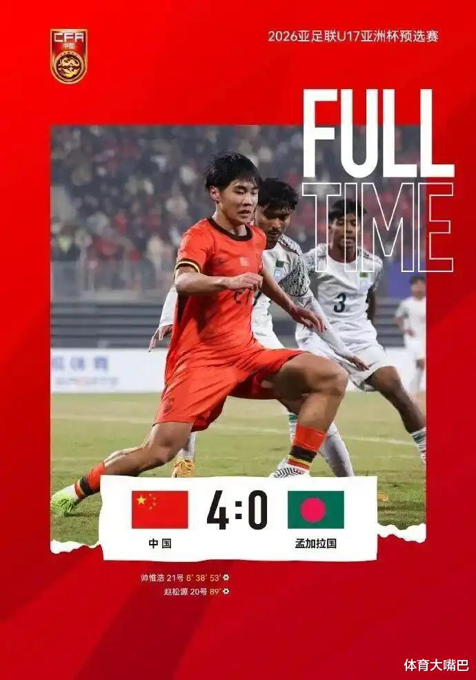 凭借帅惟浩的帽子戏法,以及赵松源的进球,中国队4-0大胜孟加拉U17国家队,如愿晋级明年的U17亚洲杯决赛阶段。在2026年,中国足球从U23到U17,将迎来3场大考。能否在这三场考核中取得好成绩,决定了中国队冲击2030年世界杯的前景。